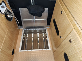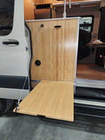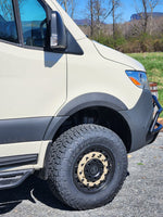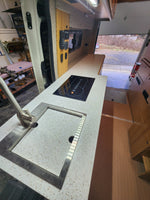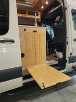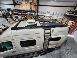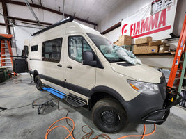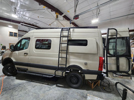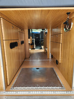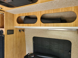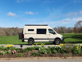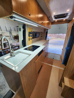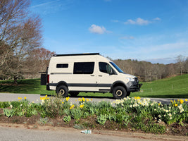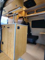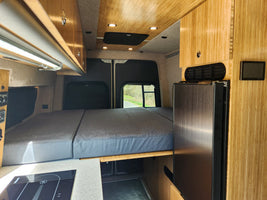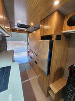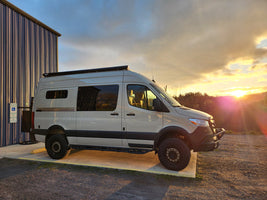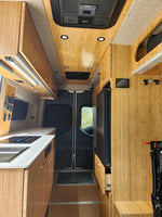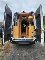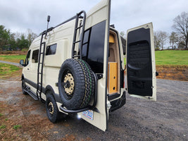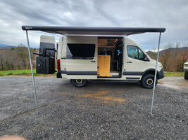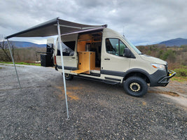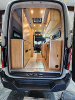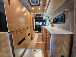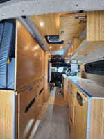 Features include: custom bamboo cabinetry, 1/2" solid surface countertops, tan tweed paneling, sandstone rubber coin flooring, fully insulated with Havelock Wool and sound insulation, stainless steel 15" x 15" sink and Moen Faucet, Webasto X1000 induction diesel cooktop, Webasto Dual top diesel heater/hot water heater, Victron Energy power system with alternator, solar and shore charging, 200 watt Zamp solar system, Dometic RTX 2000 12 volt air conditioner with remote, Maxx fan deluxe with remote, LED lighting throughout, Novakool 12 volt fridge, Laveo dryflush toilet, 3-110 volt outlets, USB ports, Fiamma awning, Owl Vans B2 rack with large cargo box, Owl Vans ladder and spare tire carrier, Owl Vans side steps, Roam Built side ladder, Flarespace flares on both sides with awning and sliding windows, FVC roof rack with decked panel, Aluminess side ladder, Van Compass 4.3 suspension and lift kit with Falcon shocks, Black Rhino Arsenal wheels with full sized spare, Baja Design LP9 Sport lights, Van Speed brushguard, 40" Riged LED light bar, Backwoods Adventure Mods rear bumper with backup lights, We Boost cell phone booster, Terrawagen hood and fender trim, custom Murphy bed and Roam Rest 5" mattress, FVC over cab shelf, Freedman 2 person flip and fold seat with 3 point belts, Lagun table, 30 gallon fresh water tank & 5 gallon gray tank, indoor and outdoor Van Compass shower pan and sprayer, L-track and insulated window shades throughout.
