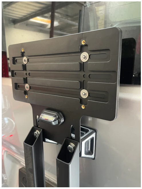 When installing the Landed Gear Spare Tire Carrier to the Left Hand Door, this steel bracket, LED light and plastic frame, mounts your license plate above the spare tire for standard height wheel placement or below the wheel for raised wheel mount. (Same part for either location.)