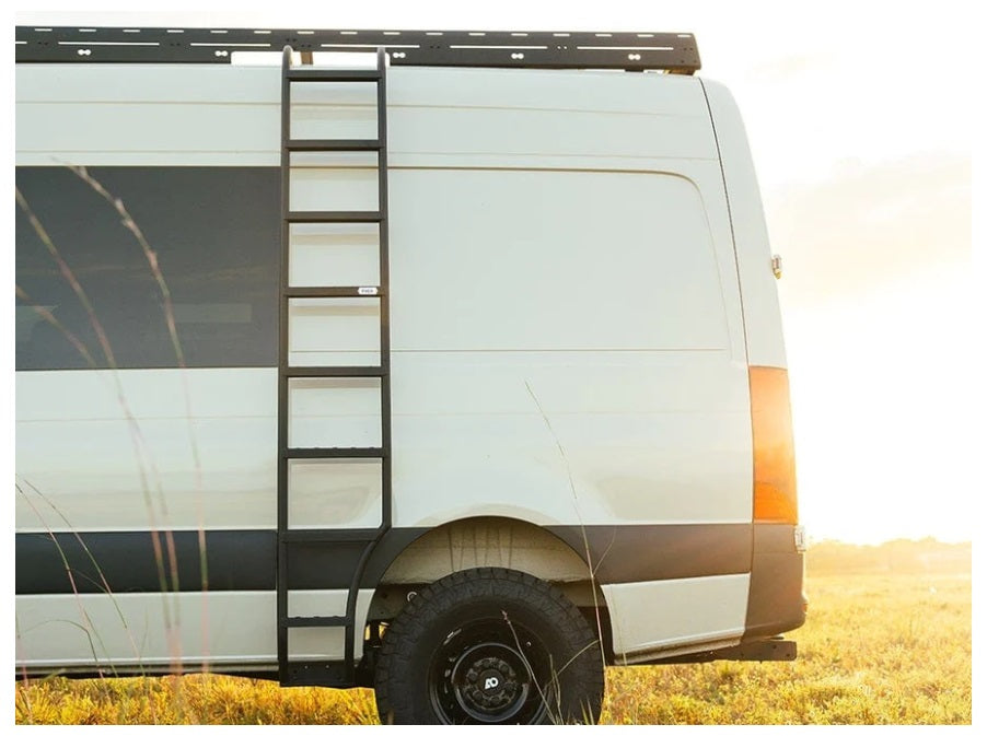 The Sprinter wheel wrap ladders' unique design allows you to place the side ladder further back than our Sprinter side ladder, so you can fully open the T-vent or pop-out windows on a 144 Mercedes Sprinter. Van ladders give you quick and easy access to the roof rack area of your Sprinter. Cleaning solar panels, mounting gear, and rooftop lounging all become easily accessible with the help of a side ladder.
