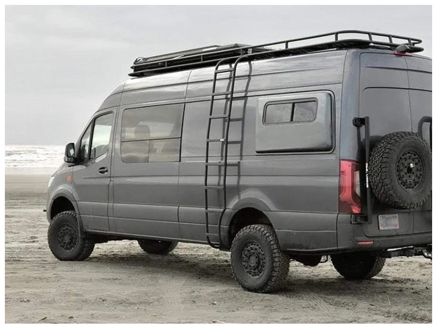 This wheel wrap ladder from Flatline Van Co is designed for Sprinter owners with T-vent or Pop-out vent windows on the driver side.